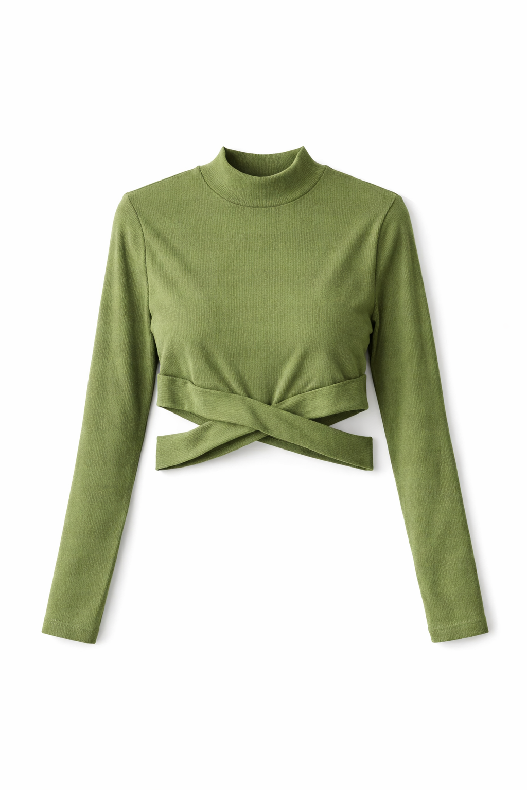 Blusa femenina de diseño moderno en tono verde musgo, ideal para crear looks sofisticados y versátiles. Su corte tipo crop con detalle cruzado en la cintura realza la silueta, mientras que el cuello alto aporta un toque elegante y contemporáneo.